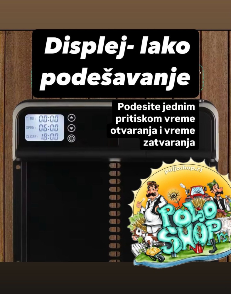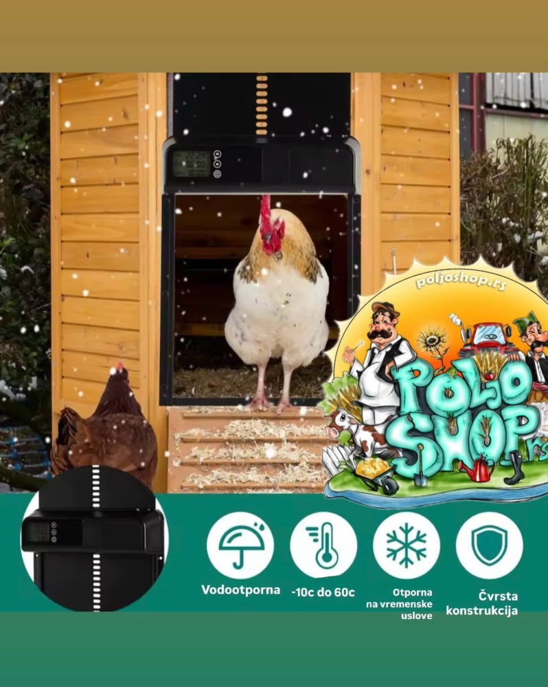 Jednostavno podesite vreme koje je trenutno i odmah ispod vreme otvaranja ujutru i vreme zatvaranja uveče i to je ceo posao oko podešavanja koji traje 20sec . Osmišljena su tako da štite kokoši od predatora, obezbeđujući sigurno okruženje, dok istovremeno omogućavaju slobodan pristup spoljnjem prostoru tokom dana i zatvaranje kokošinjca u noćnim satima. Izrađena su od otpornog materijala koji podnosi vremenske uslove,