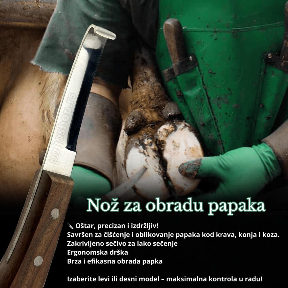 Nož za obradu papaka je specijalizovan alat dizajniran za precizno, sigurno i efikasno čišćenje i oblikovanje papaka kod krava, konja, koza i drugih papkara. Izrađen je od kvalitetnog, oštrog i izdržljivog čelika, sa ergonomskom drškom koja obezbeđuje stabilan hvat i maksimalnu kontrolu tokom rada.